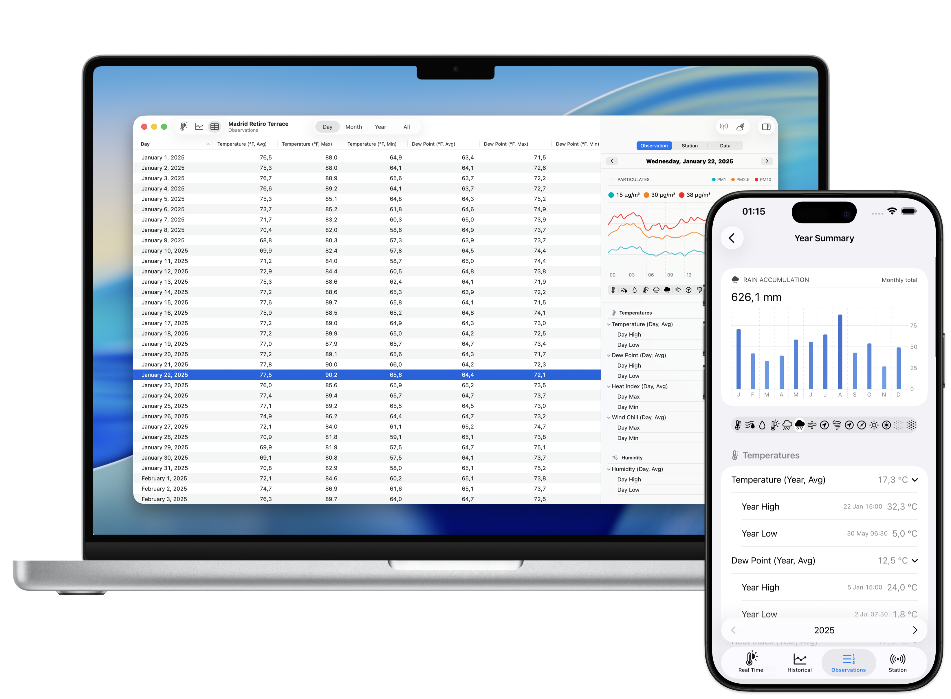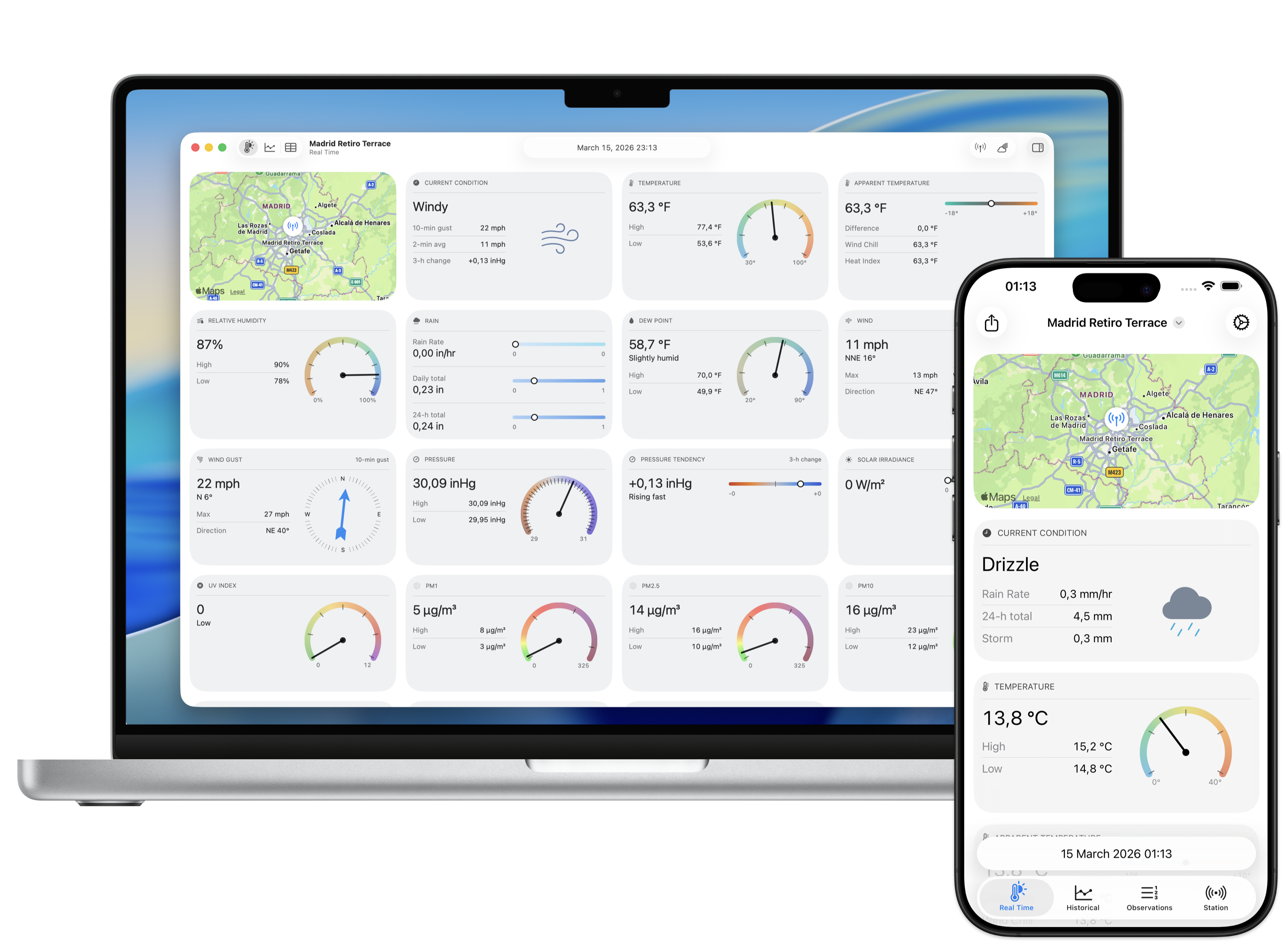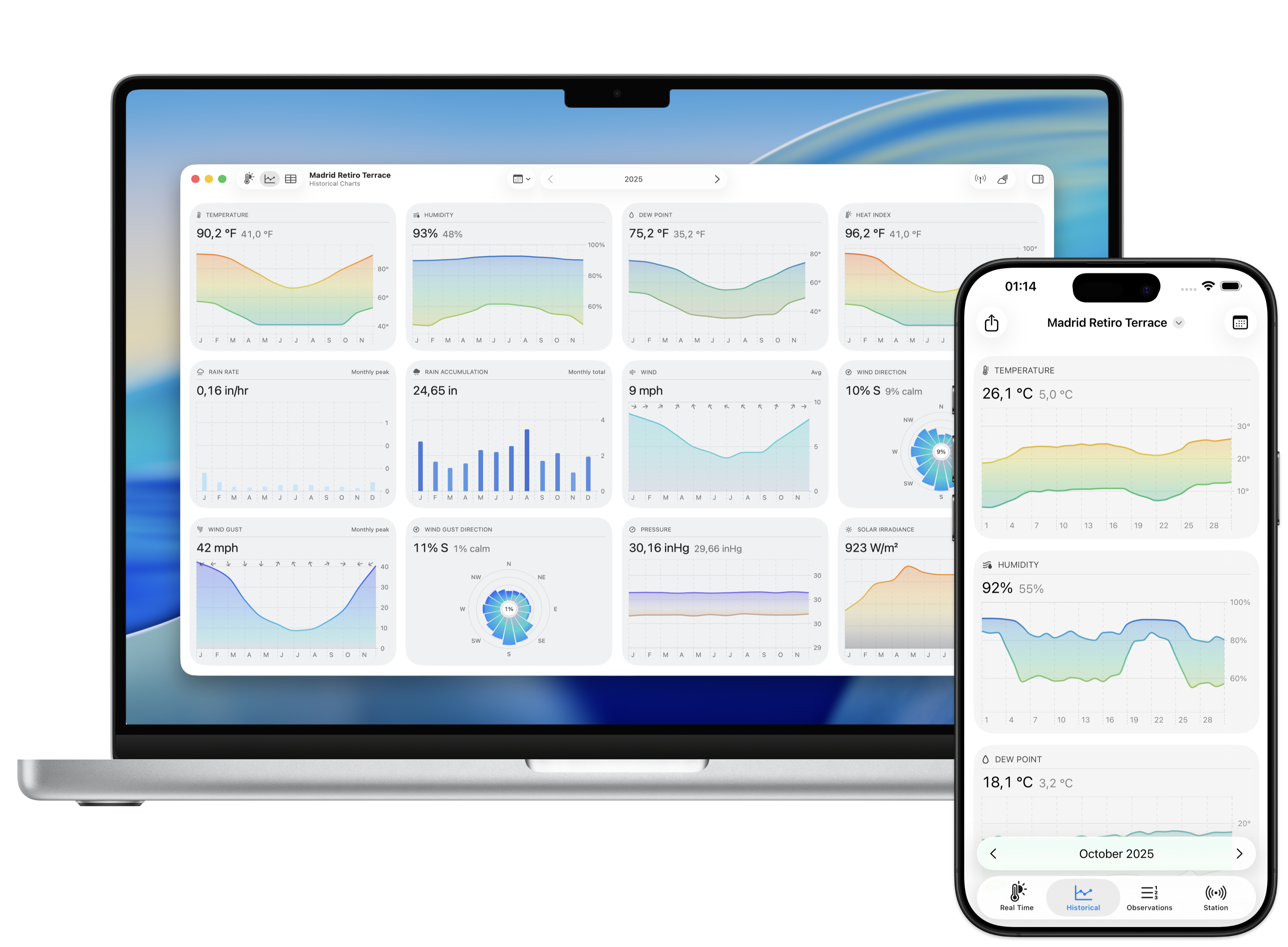 Weather Fusion brings live conditions, historical charts, and observations together so you can follow changes, compare patterns, and explore your station history on iPhone, iPad, and Mac.