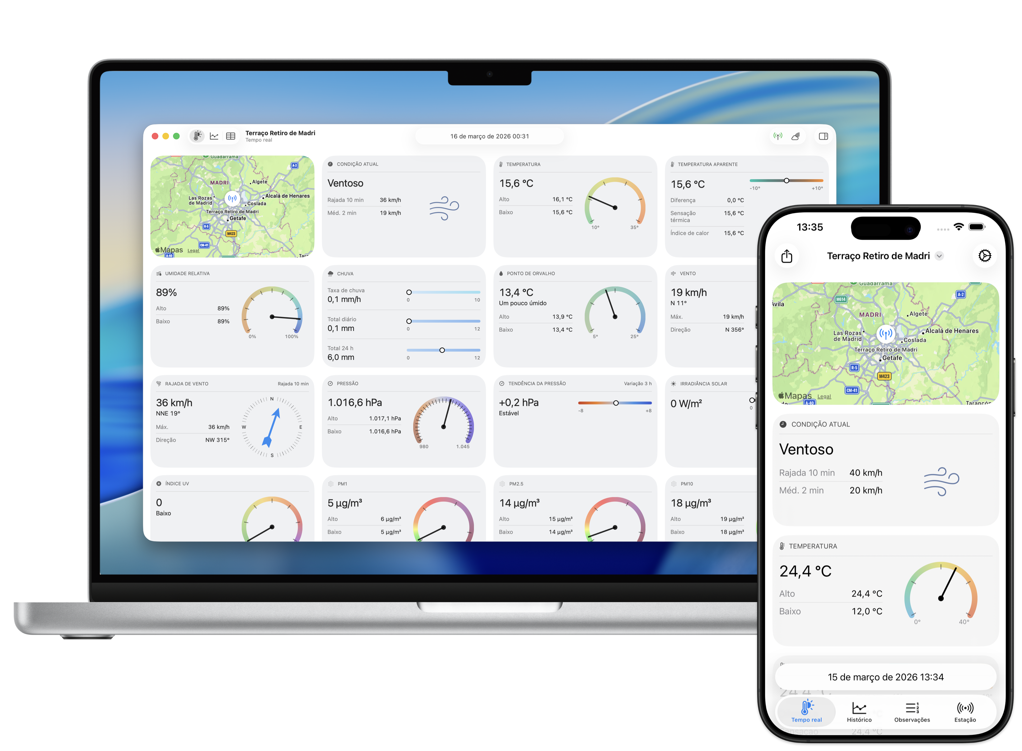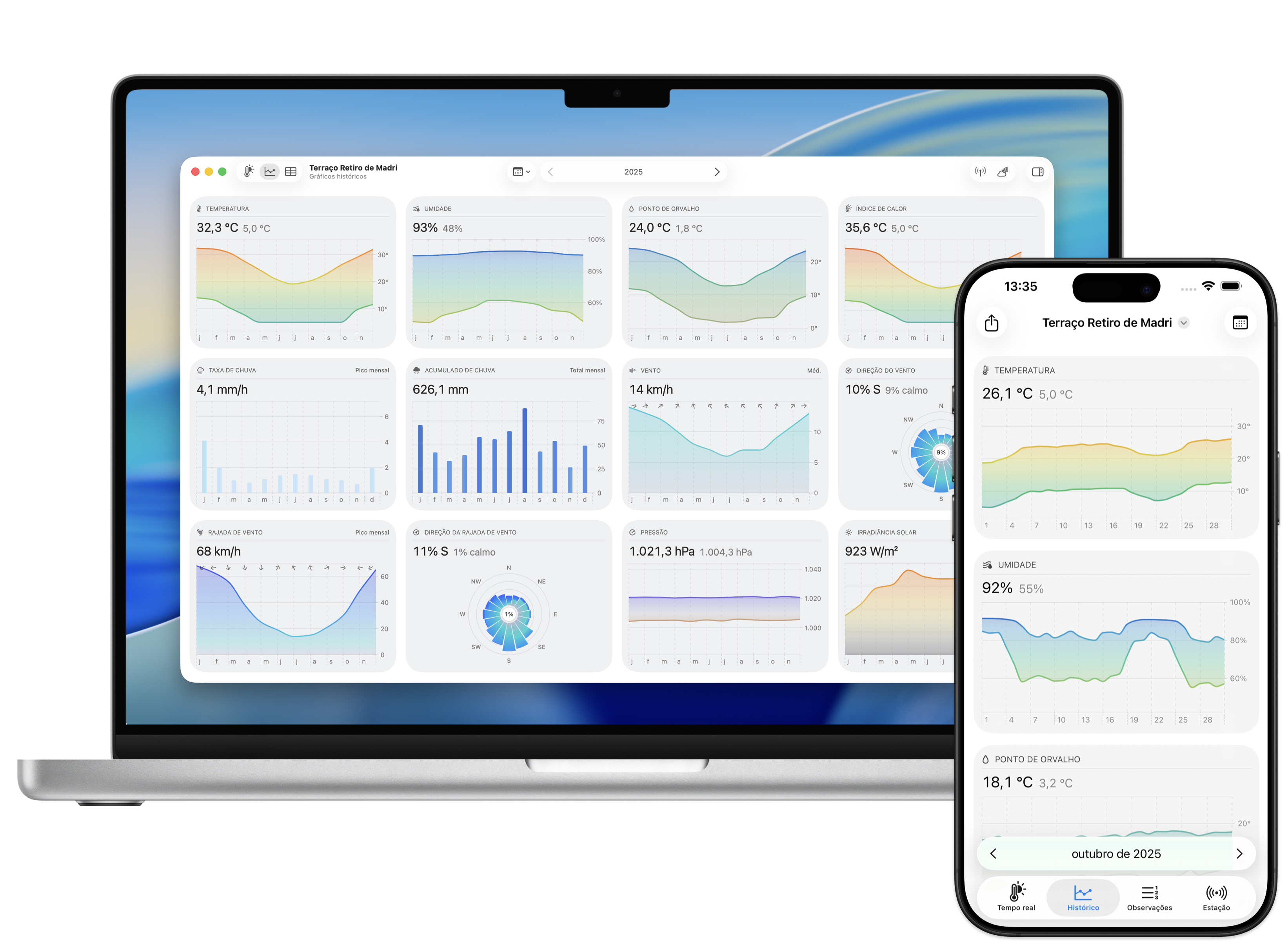 Acompanhe leituras em tempo real com indicadores fáceis de ler, condições atuais e o contexto necessário para entender as mudanças do tempo.