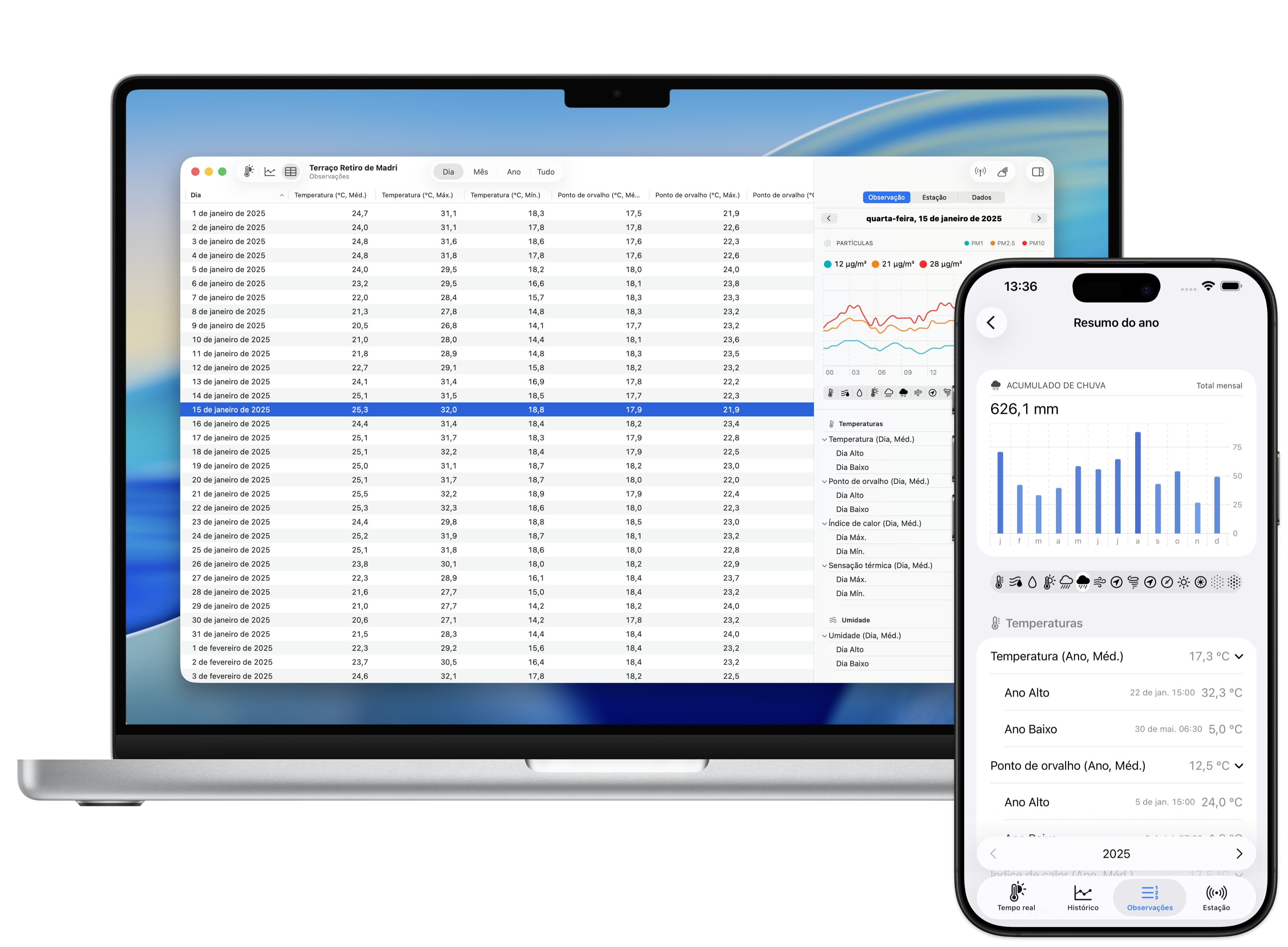 Weather Fusion reúne condições em tempo real, gráficos históricos e observações para ajudar você a acompanhar mudanças, comparar padrões e explorar o histórico da sua estação no iPhone, iPad e Mac.